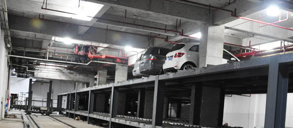 这是一种技术含量和智能化程度较高的仓储式停车设备。可根据场地的不同设置在室外(一般采用全封闭型式)、室内、地上或地下。存车容积率高,安全可靠。同时,该设备也要求存车空间相对独立,无其它设备的干扰,且设备成本较高。一部巷道堆垛机和搬运器所负责的车辆在50~100辆之间较为合适,不宜超200辆。每一层的停车数量一般在20辆以上,层数的确定应根据不同车库的具体使用面积,通常选择五层左右较为合适。